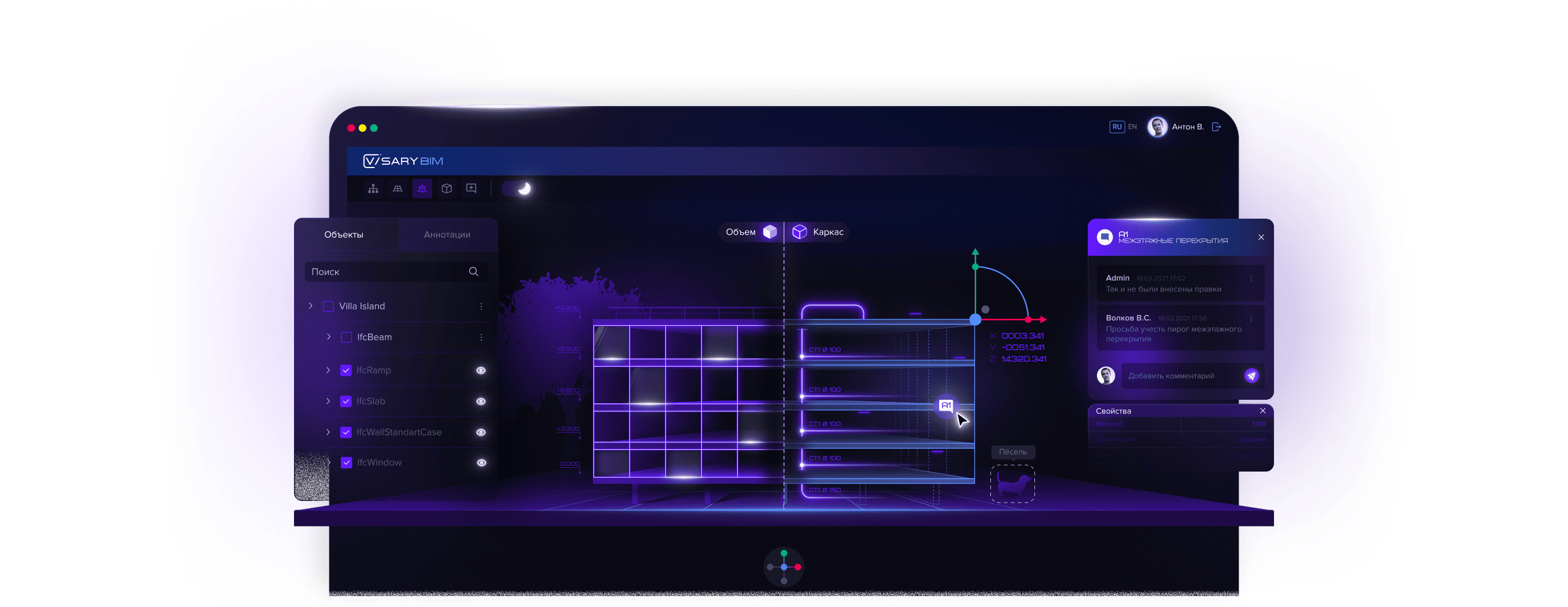В Visary BIM реализована возможность ведения дискуссии между участниками проекта в форме комментариев и примечаний к 2D и 3D-модели объекта или ее компонентам.