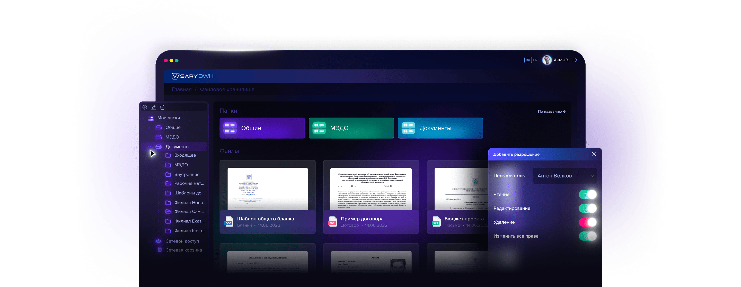 Пользователям доступен набор полезных функций: обмен, быстрый перенос файлов, хранение и редактирование документов со встроенным офисным редактором, поддержка версий и гибкая настройка прав доступа.